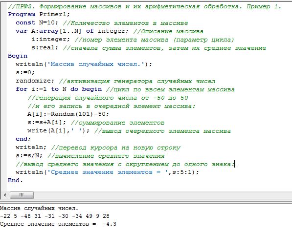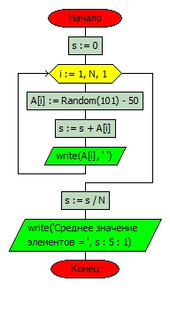 Пример 1. Составить программу для формирования массива А из N целых случайных чисел в диапазоне от -50 до 50 и вычисления их среднего арифметического значения.