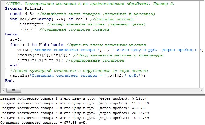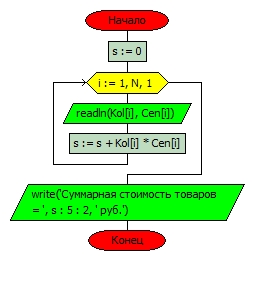 Пример 2. На складе хранятся товары. Для каждого вида товара известно количество единиц товара и цена за единицу товара. Определить суммарную стоимость всех товаров, хранящихся на складе.