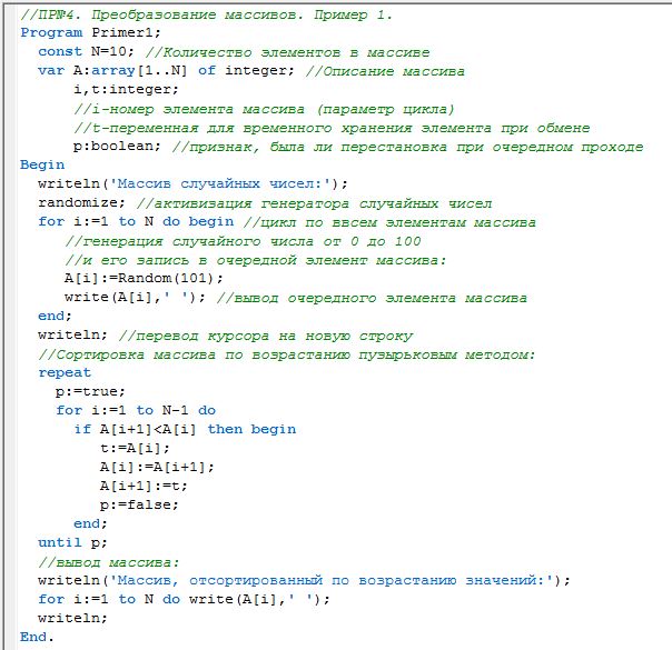 Пример 1. Задан массив А из N чисел. Упорядочить элементы массива по возрастанию их значений.