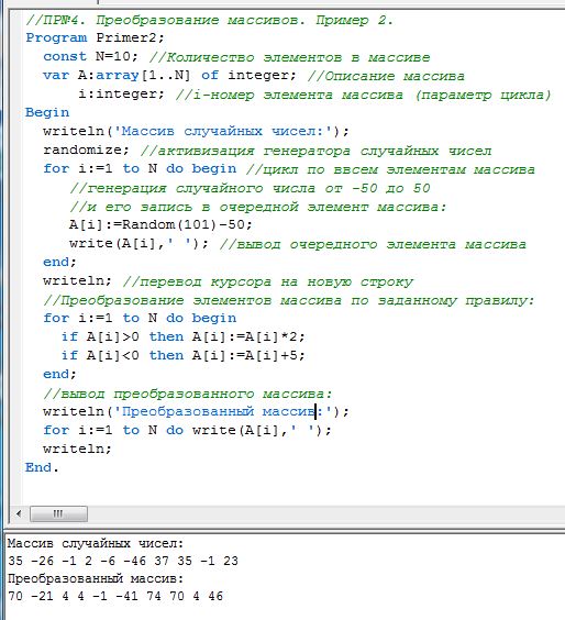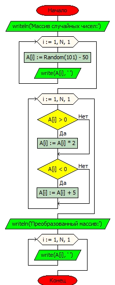 Пример 2. Задан массив А из N целых чисел. Преобразовать его элементы по следующему правилу: положительные элементы увеличить в 2 раза, а отрицательные увеличить на 5.